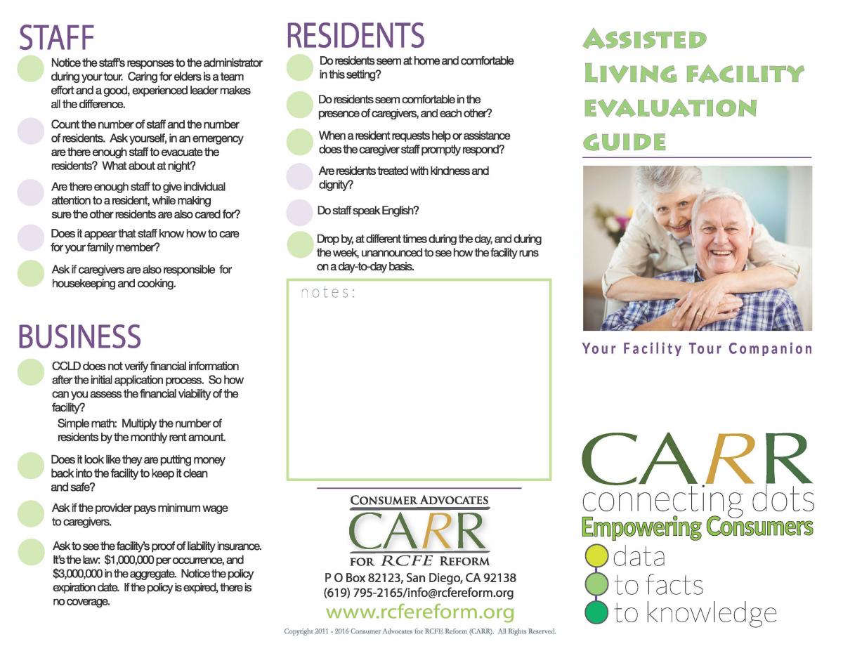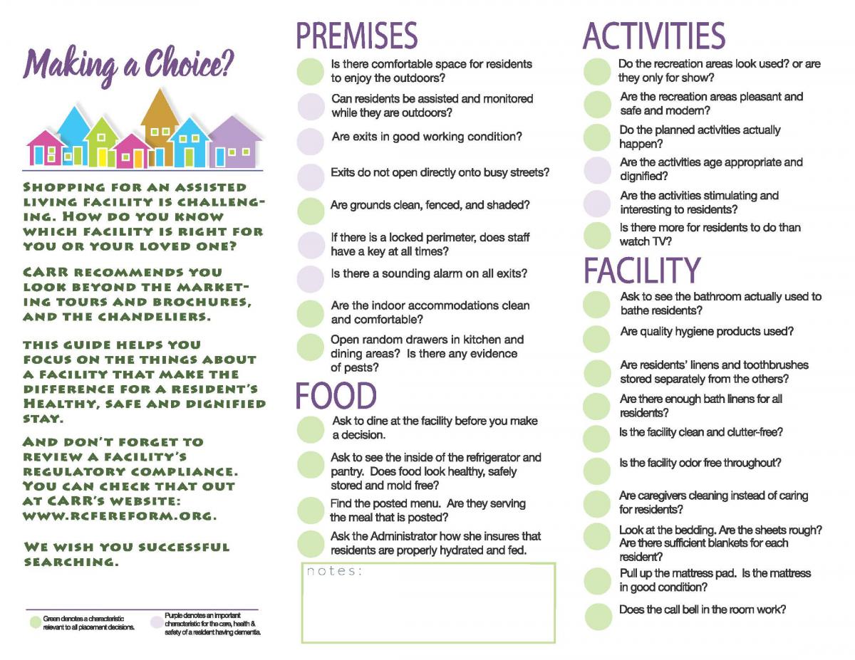 Checklists are useful tools to make sure you ask all the questions you want to ask. The checklist will also help you think of other questions you may want to ask. They can help narrow your choices, letting you keep track of what you like and don't like in a facility. Each link gives a different point of view on what to look for. All are free to you.